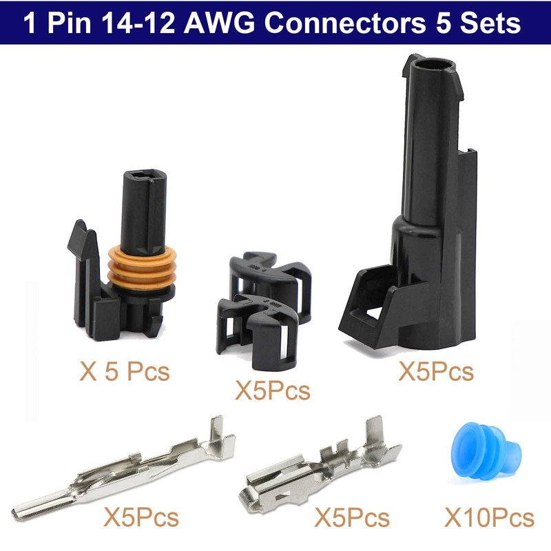 - 【Package Content of WeatherPack Connectors】5 Kit waterproof electrical connectors 1 pin with male & female terminal, 1 pin waterproof connectors: a total of 5 set of automotive connectors waterproof are included, Ideal for 14-12 AWG wires.