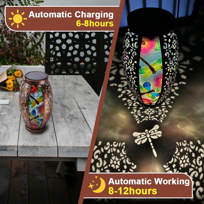 - Widely Used: Stained glass & metal solar lantern can add color, charm and warmth, so it is a great garden decor, festival decor, party decor; Dragonfly tabletop solar light is a nice Father's Day, Mother's Day, Christmas, birthdays, housewarming gift