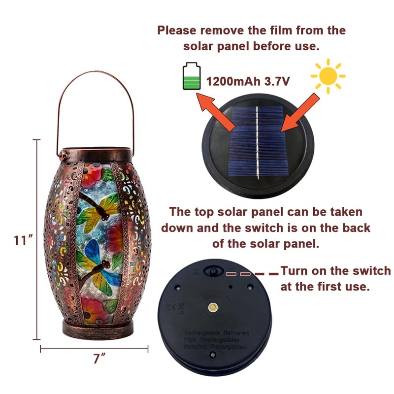 - Solar Power Lantern: Our dragonfly solar lights are equipped with larger denser solar panels and a 3.7V 1200mAH battery; Make sure the switch on the back of the solar panel is on before use; Automatic charging during the day, automatic lighting at night