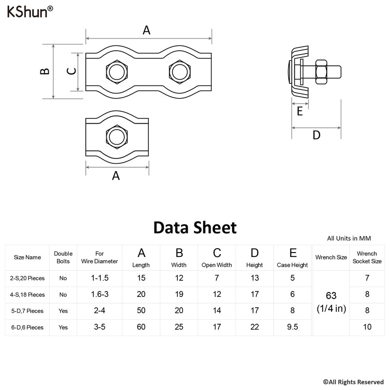 - The wire rope clamp fits the wire size range 2mm to 4mm. A socket wrench is required during installation. For other sizes of wires, we have matching clips for your choice in the same series.