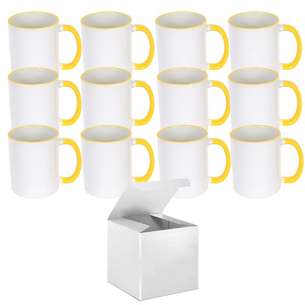 - Set of 12 11OZ YELLOW Rim and Handle Sublimation Mugs- 100% Lead and Cadmium-Free.. Each Mug comes with Individual Cardboard Gift Boxes