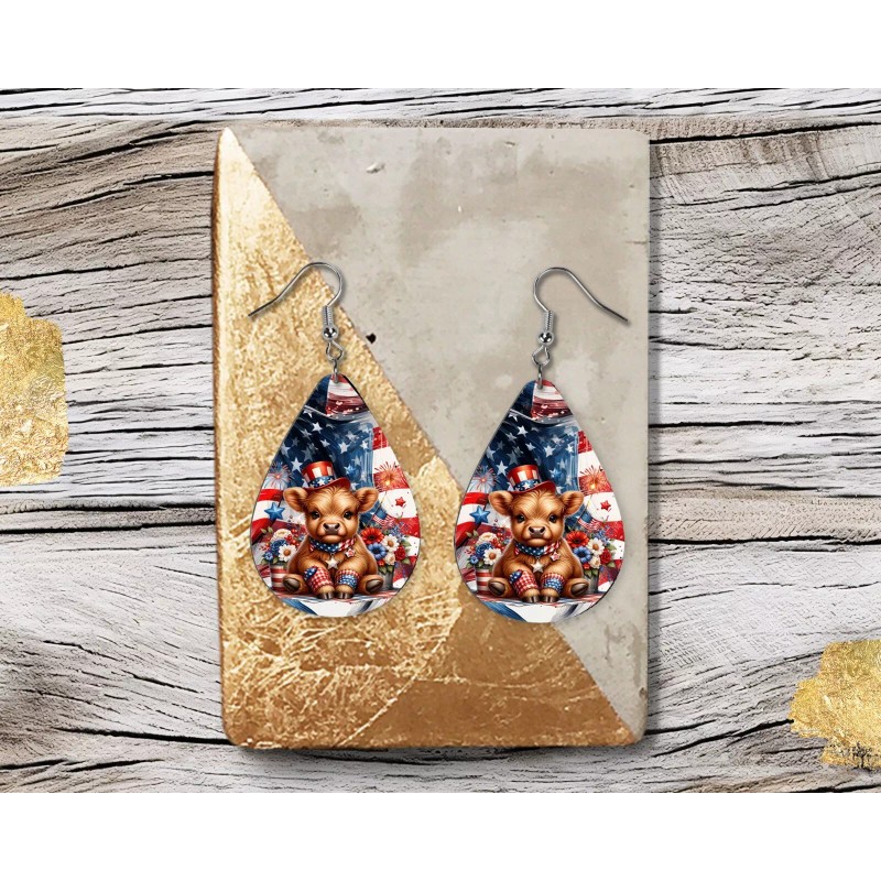 Twisted R Design Earrings, 4th of July Highland Cow Wood Dangle Teardrop Print Earrings Jewelry
