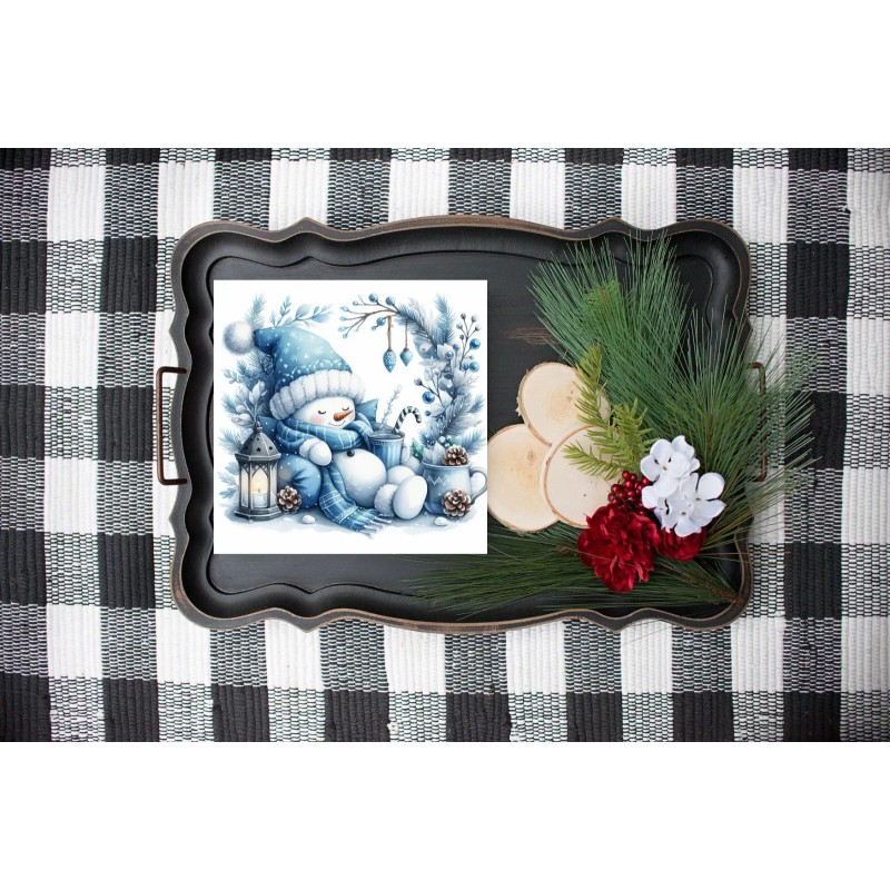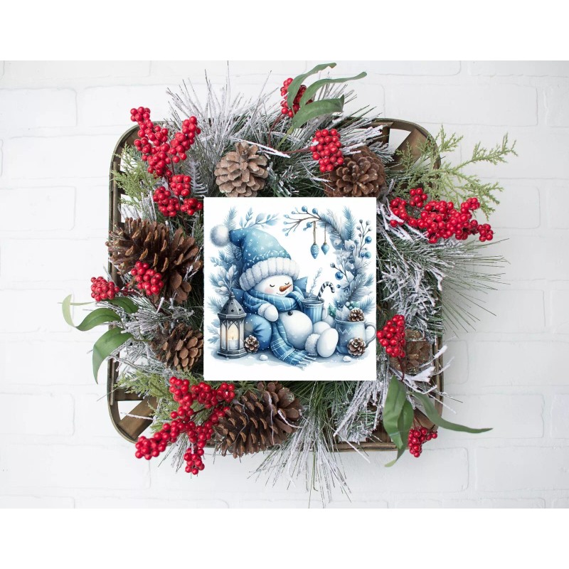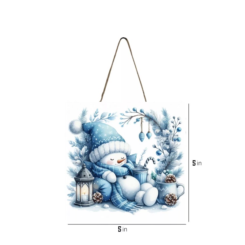 Twisted R Design Sleeping Snowman Blue and White Christmas Ornament, Wood Mini Sign