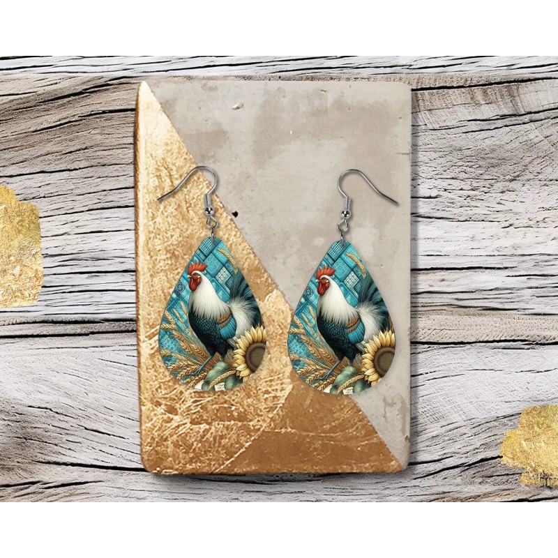 Twisted R Design Teal Rooster Wood Dangle Teardrop Print Earrings Jewelry