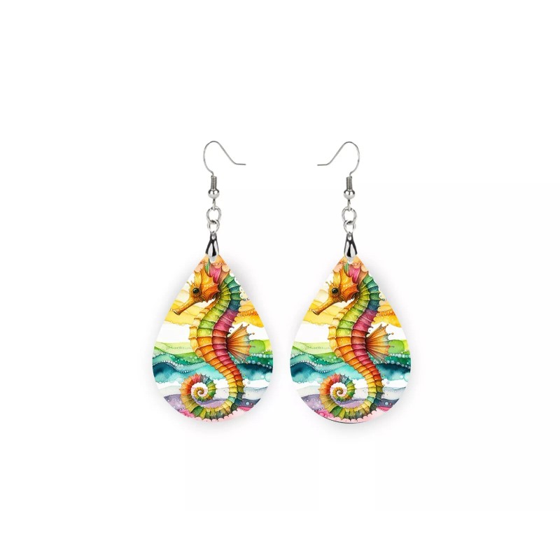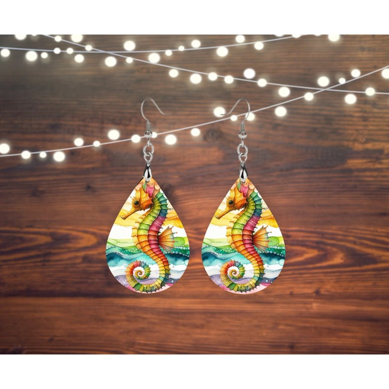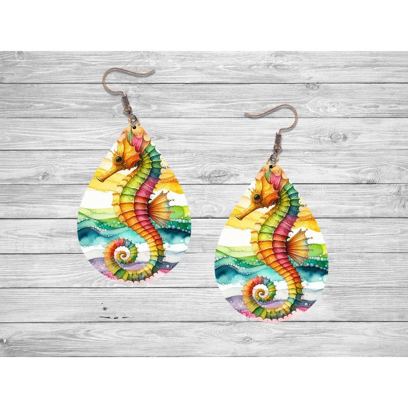 Twisted R Design Tropical Seahorse Print Wood Dangle Teardrop Print Earrings Jewelry
