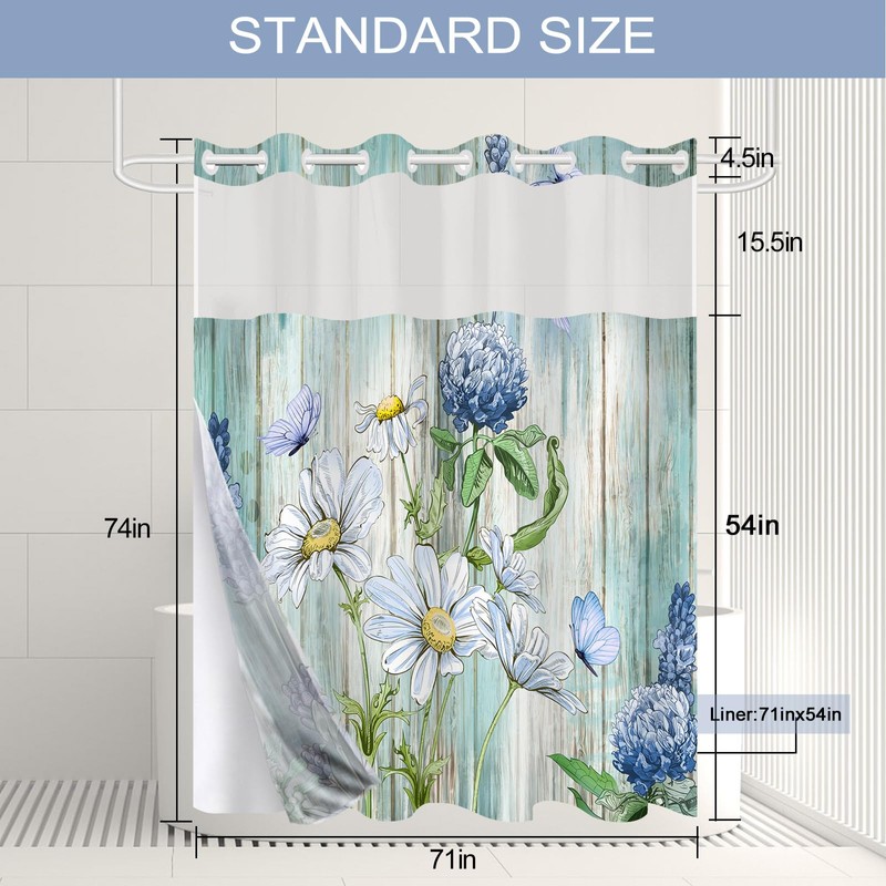 TWLSNCD No Hook Blue Daisy Shower Curtain with Snap in Fabric Liner Set, Rustic Farmhouse Wooden Flower Butterfly Curtains, Wasbable Inner Liner, See Through Mesh Top Window, 71x74 Inches