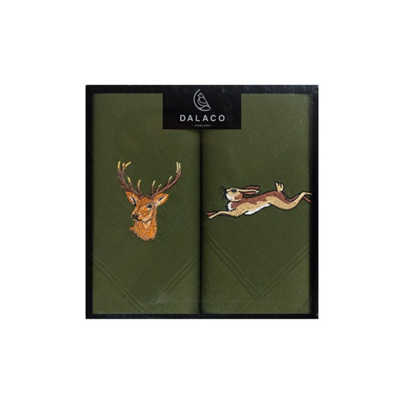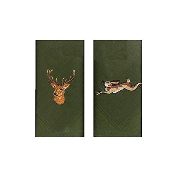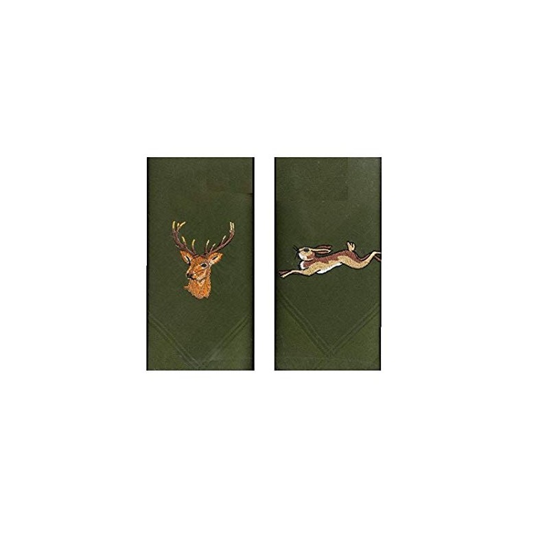 Two 40cm Square cotton embroidered green handkerchiefs with a stag head on one and a running hare on the other