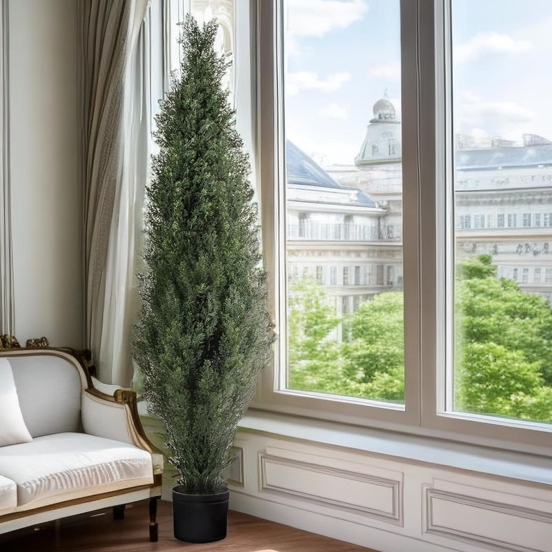 - [Easy to Care] This artificial cedar is lifelike in shape. No need for manual pruning, it can withstand the wind and rain. It can be used indoors or outdoors. This material is added with anti-ultraviolet materials to protect cedar from sunlight. After receiving it, you can put it on the ground and use it directly, or you can plant it in a beautiful flowerpot to make it look more beautiful.