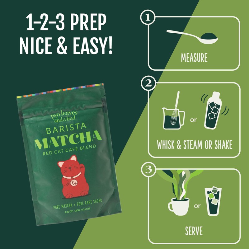 - Easy Preparation: Whether enjoyed hot or cold, preparing Barista Matcha is quick and easy! Simply mix the powdered blend with your choice of milk or milk alternative for a delicious matcha latte in moments.