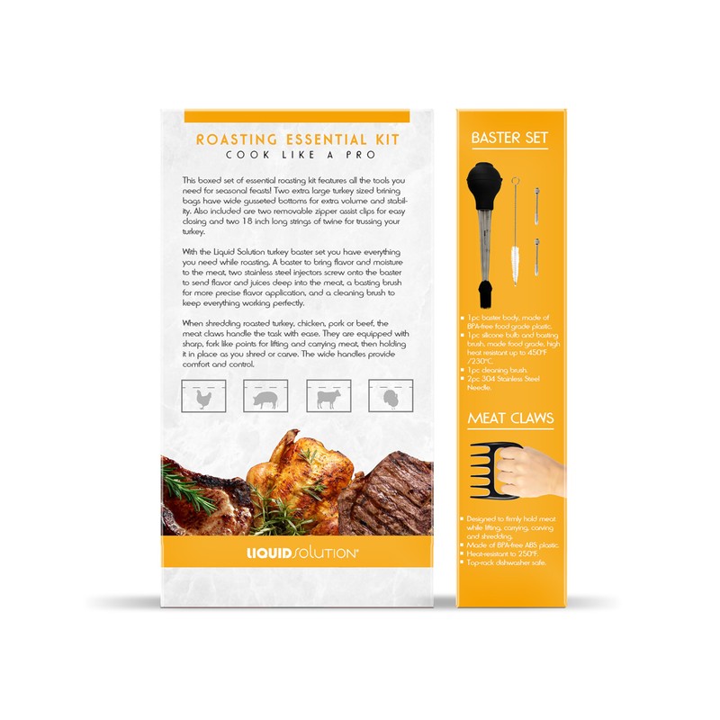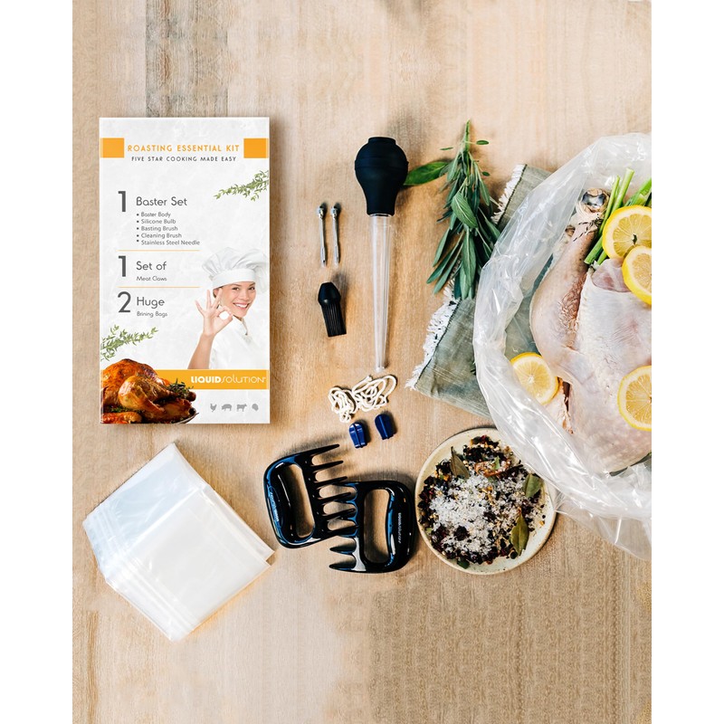 - Basting Set: The Liquid Solution turkey baster set includes a baster for adding moisture and flavor, two stainless steel injectors for deep flavor infusion, a basting brush for precise application, and a cleaning brush for easy maintenance.
