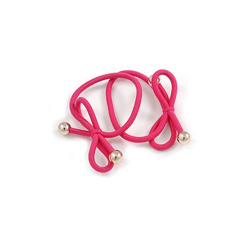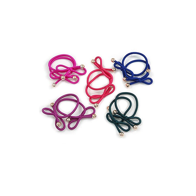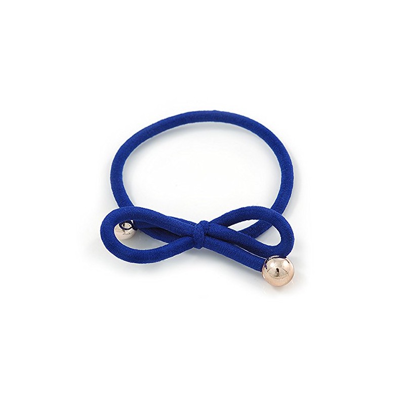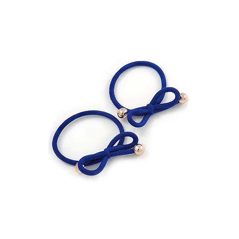 Set of 2 hair elastics in violet blue tone. Set includes 2 violet blue thick elastics decorated with a bow motif and two gold tone plastic beads. Suitable for all hair types. A great basic for your hair wardrobe, ideal for school.