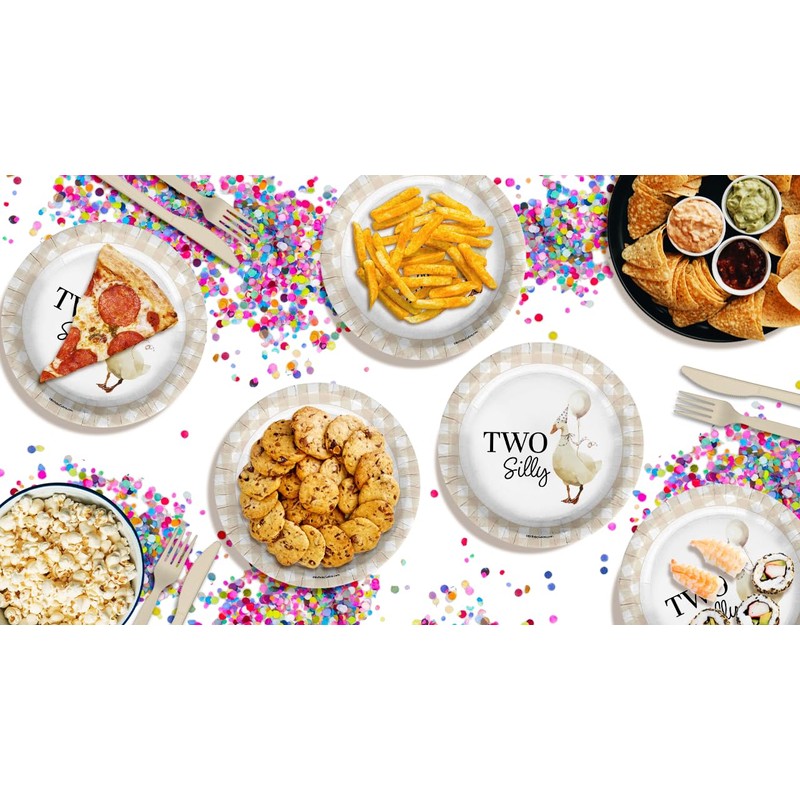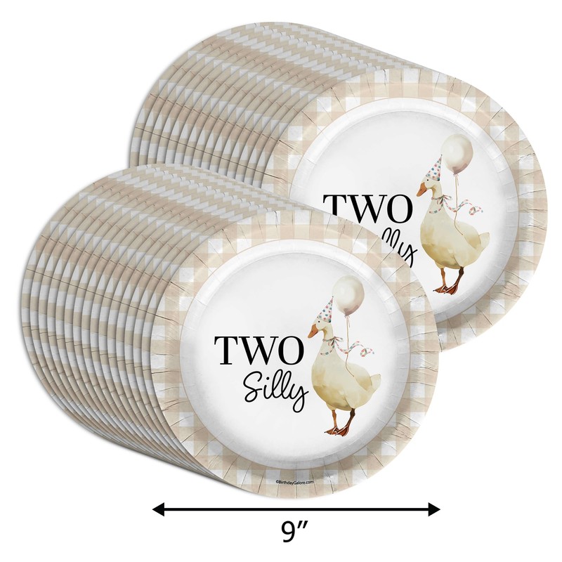 Two Silly Goose Second Birthday - 32 Piece Disposable Party Supplies - Decorations for Gingham 2nd Birthday Round Party Plates - Large 9" Paper Plates In Bulk