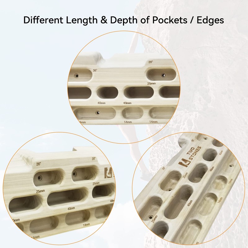 - 💪 [Multi-Functional Design]: The rock climbing hangboard is with outer jugs, slopes(2 different angles), 1/2/3/4 finger pockets(4 different depths) and edges designed to strengthen your grip