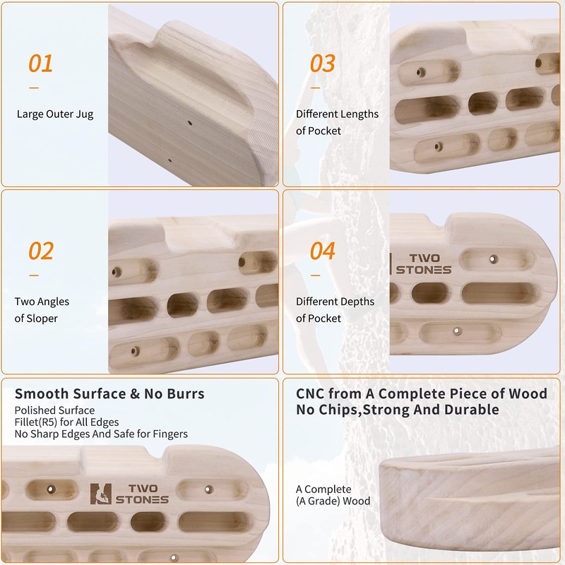 - [Polished Surface]: The wooden fingerboard with fillet(R5) for all the pockets edges and smooth polished on all the surface of the pockets, jugs, slopes or the pinches which allows long-term hanging and no pains on fingers.