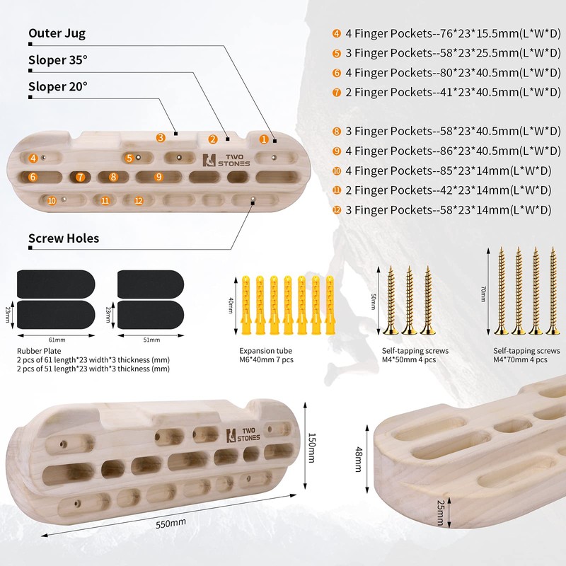 - [Multi-Functional Design]: The rock climbing hangboard is with outer jugs, slopes(2 different angles), 2/3/4 finger pockets(4 different depths) and edges designed to [Strengthen Your Grip]:The climbing fingerboard is to simulate various holds and strengthen your fingers, wrists, hands, arms, grips, body tension core strength and endurance;