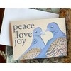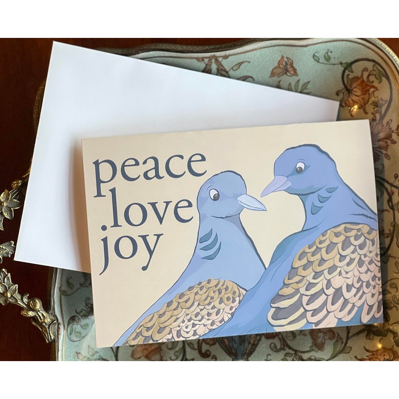 - "Peace Love Joy" message written on the outside of the card. The inside is blank to give you plenty of space to write your own holiday greeting.