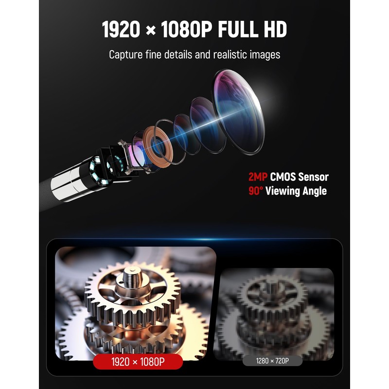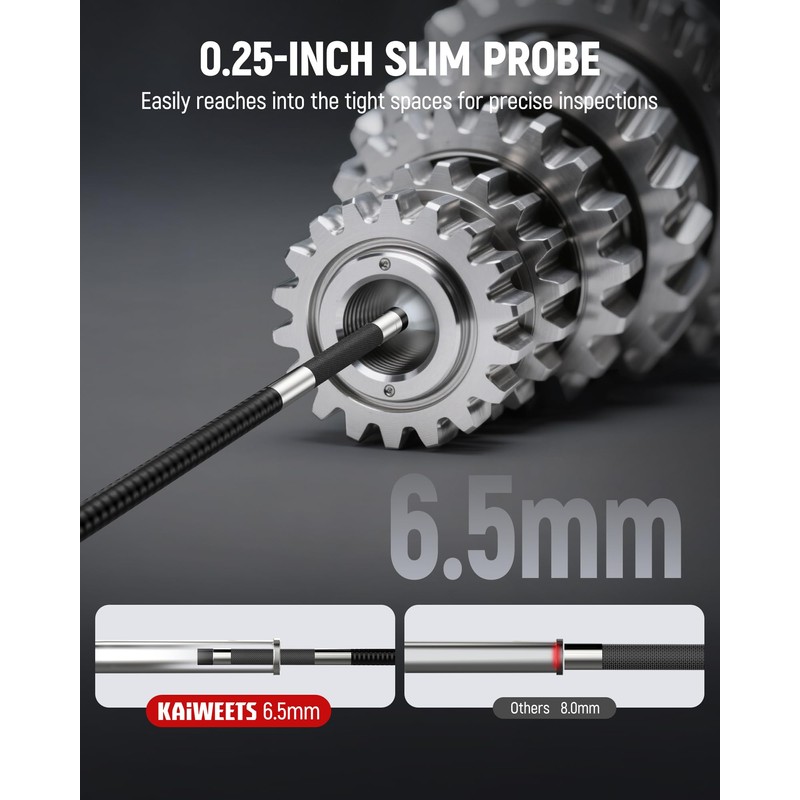 - Ultra-Slim 0.25in Camera with Dual Lighting System: The 0.25-inch ultra-thin probe easily slips into narrow gaps that standard endoscopes can’t reach. A 2MP lens captures sharp visuals, while six adjustable LED lights illuminate dark environments, letting you fine-tune brightness for optimal visibility. An additional rear-facing flashlight enhances visibility, helping you work efficiently in low-light conditions