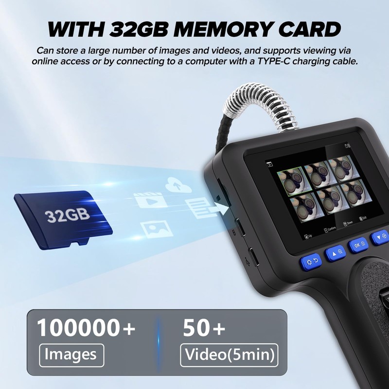 - [2600mAh BATTERY & PHOTO/VIDEO Playback]The N100 industrial endoscope Includes a 32GB memory card for massive photo/video storage, supporting HD playback via online access or TYPE-C cable connection to computers, smartphones, and iPads. The 2600mAh rechargeable battery delivers 4-5 hours of continuous operation, eliminating frequent charging needs.
