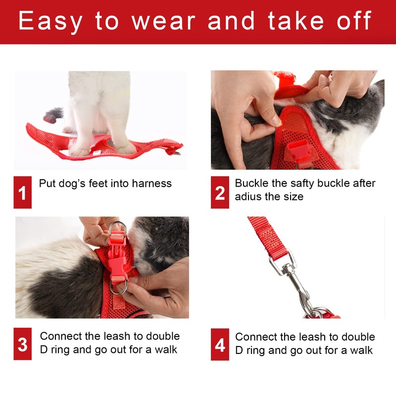 - 【Easy to Wear】: The step-in design is easy to put on and off, just adjust the harness, affix the velcro to fit your dogs, fasten the buckle, then connect the leash and ready to walk.
