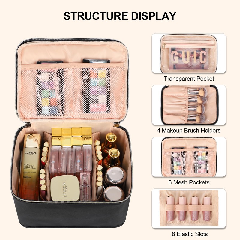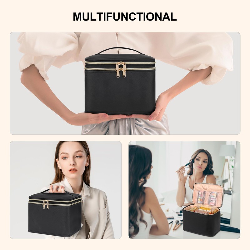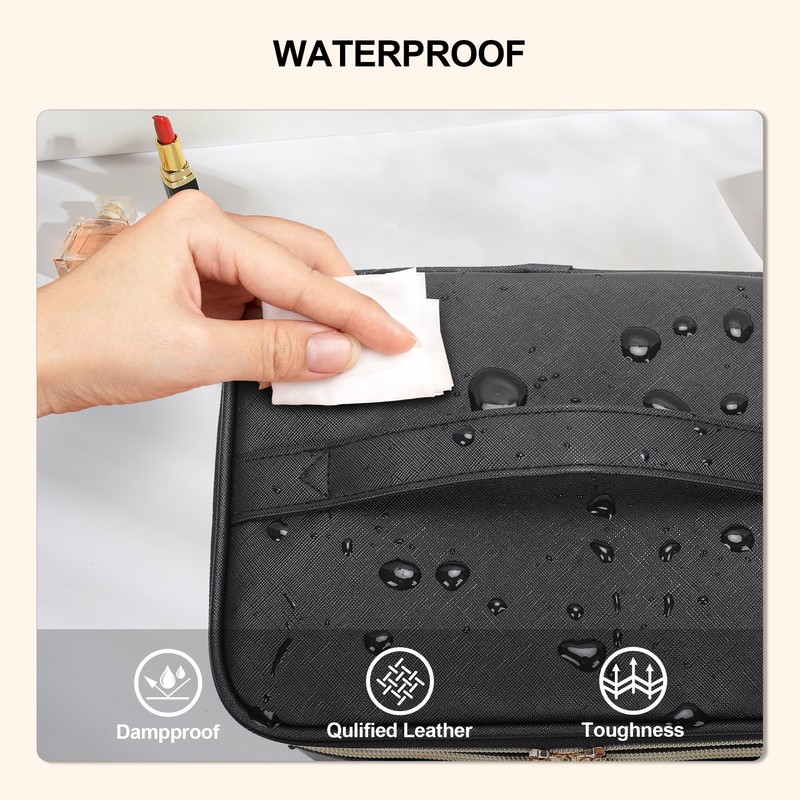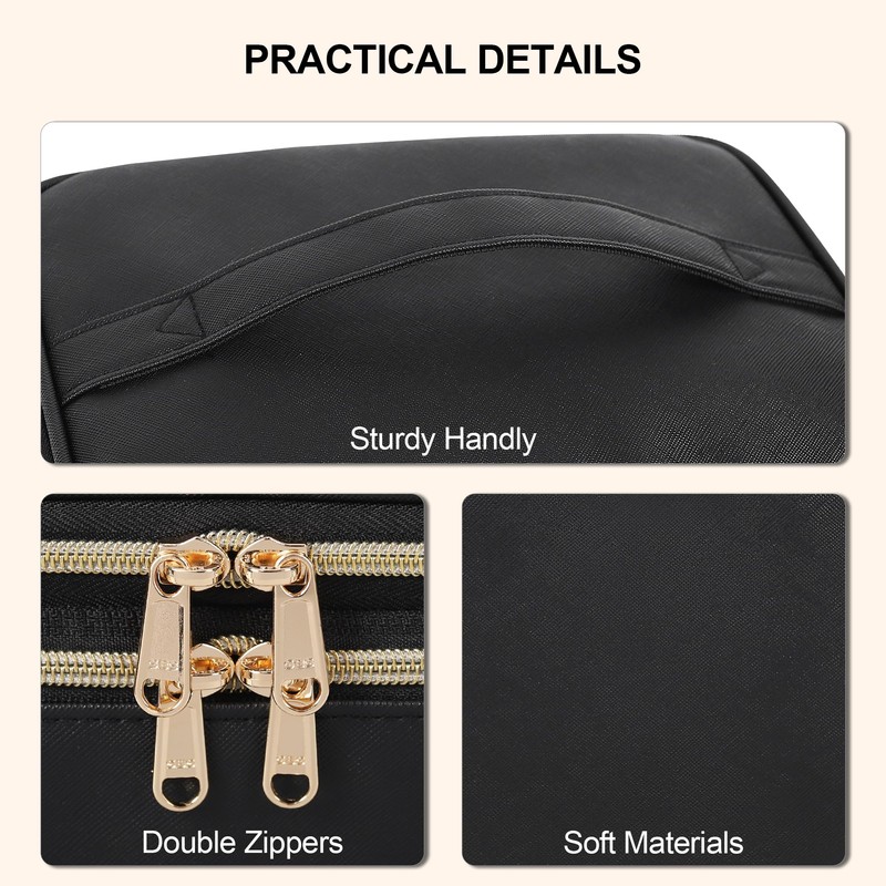 - LARGE CAPACITY MAKEUP BAG - 10*7.5*6.5IN. It is space-efficient & deep enough so that you could place your bottles vertically and safely.