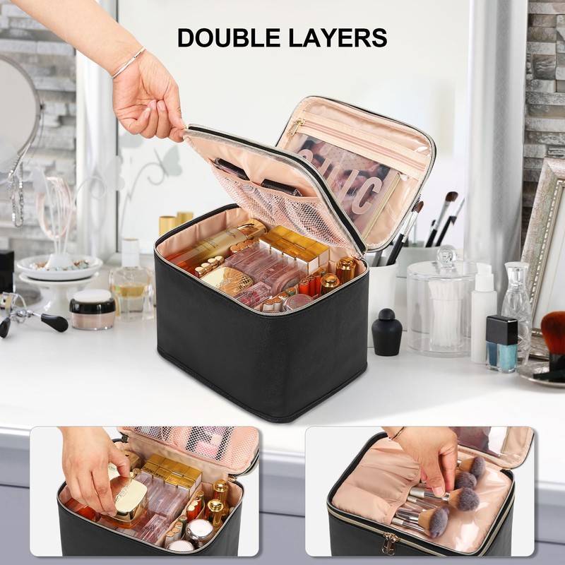 - DOUBLE LAYER PARTITION DESIGN - The spacious cosmetics case is designed with top and bottom storage compartments, which is roomy for all of your beauty palettes, lip kits, foundation and bronzer. Perfect for organizing essentials.