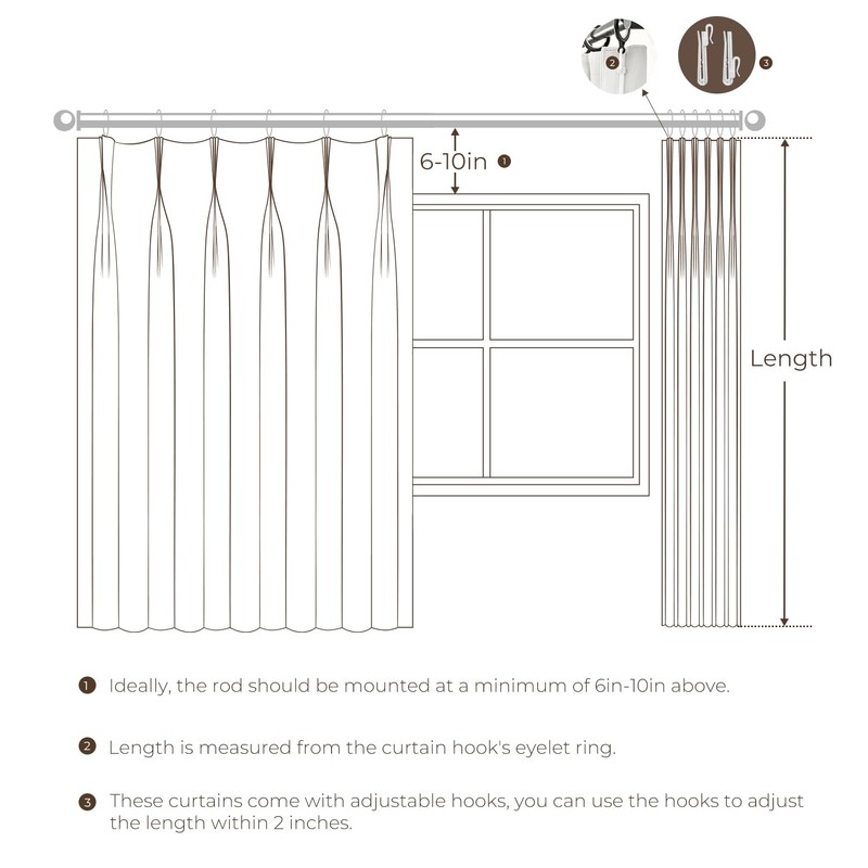 - Measurements: In this listing, the width is the width of a single curtain, not overall width of 2 panels. For example, if your rod is 100" width, please choose a 50" wide curtain set. Single panel pleat number: 6 pleats for 26" wide, 10 pleats for 52" wide, 14 pleats for 72" wide. As for the length, please measure from the ring eyelet.