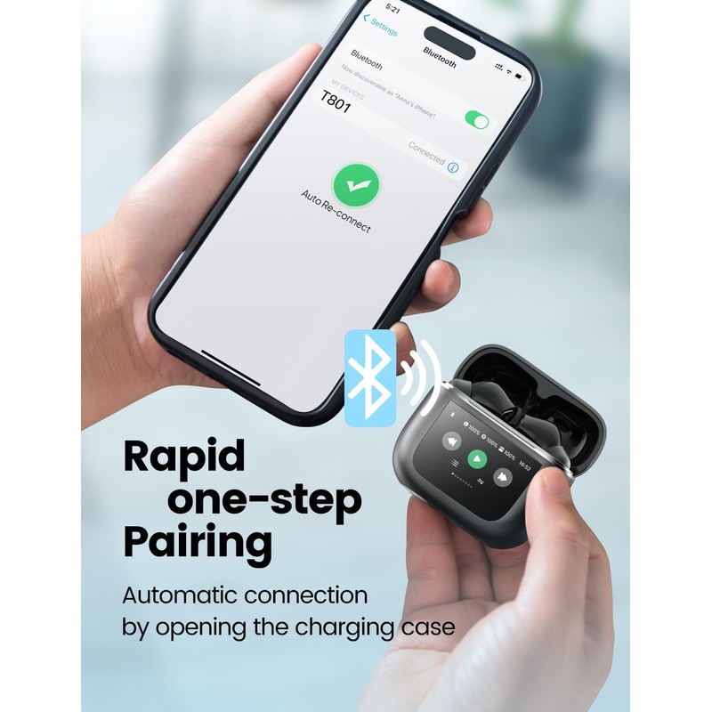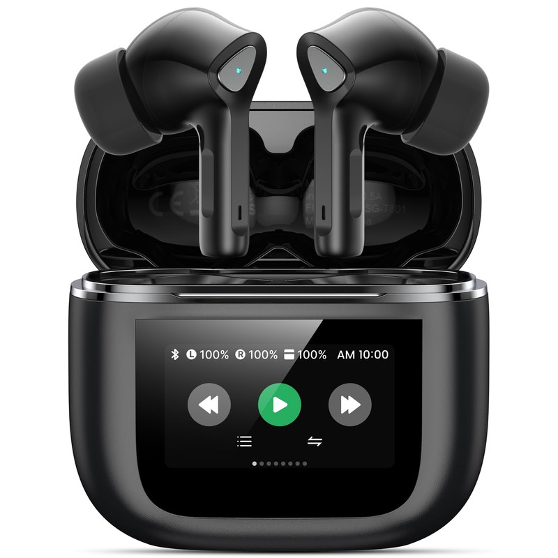 - Smart LED Touch Screen Charging Case: The wireless earphones have a large LED touch screen that allows you to check the date and time, as well as clearly display the battery level and bluetooth connection status of the earbuds and charging case. It also has music equalizer, find headphones, take photos, adjust brightness, adjust time, set alarm, adjust song volume and skip songs, display lyrics and other functions. This makes it super easy to manage music and calls