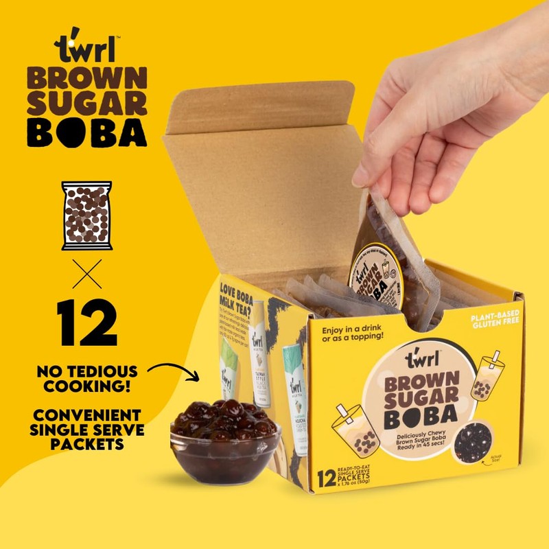 - Boba At Home. Twrl Brown Sugar Boba arrives ready to eat in single-serve packaging! Open a pack of Boba and a can of Twrl Milk Tea, and VIOLA: A tasty, low calorie, cafe-style milk tea. Happy Sipping!