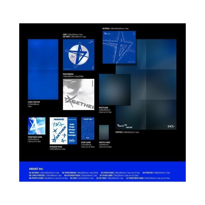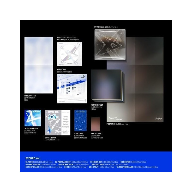 Box contents: Out Box + Photobook (100p) + Postcard (Random 1 out of 5) + Poster + Lyric Poster + Sticker Pack + Starcard (Random 1 Out of 12) + Photocard (Random 1 Out of 5) + CD-R + CD Tray + Together Card (Random 1 Out of 3)