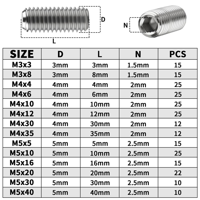 - Package contents: you will receive 15 pieces TXXATX grub screws M5 x 5 mm. The TXXATX M5 grub screws have a diameter of approx. 5 mm and a length of approx. 5mm Grub screws are suitable for attaching parts such as bearings and bushings in axial position and are ideal fasteners for door handles, lights, buttons, pulleys, couplings and other equipment.