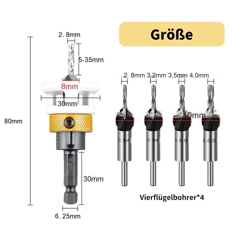 - Size: the 4 piece countersink drill set includes 4 different sizes: 2.8 x 8 mm, 3.2 x 8 mm, 3.5 x 8 mm, 4 x 8 mm.