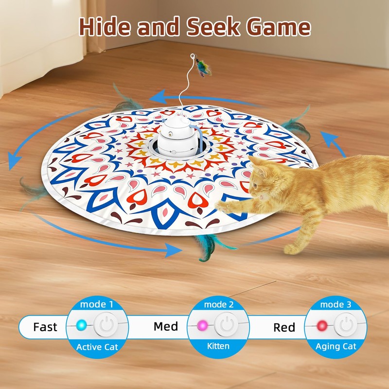 - đșăInteractive Entertainment for CatsăThis newly upgraded indoor cat toys provide an engaging, stimulating play experience for kittens and older cats alike. This automated toy features a rotating light beam and feather on the top, a removable cover, an enticing feather wand hidden under the cover, consisting an ambush hide-and-seek game.