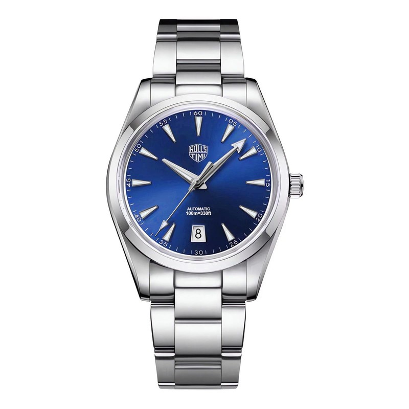 - Simple Business Men's Watch: the RollsTimi 7912 Men's Watch measures 39mm in diameter and 13mm thick. The case and bracelet are made of 316L stainless steel with a highly translucent synthetic sapphire crystal. With a simple three-hand design and a date window at six o'clock, the classic watch construction is designed for business style and masculine appeal.