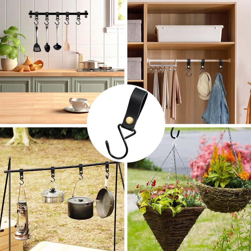 - Metal S Hooks Combined with Leather Straps: these hooks perfectly combine the S hook with the leather strap, which opens and closes with a push button for quick and easy access. The S hook is fixed by rivets and will not fall off like other S hooks when you pick up the item, which is very convenient.