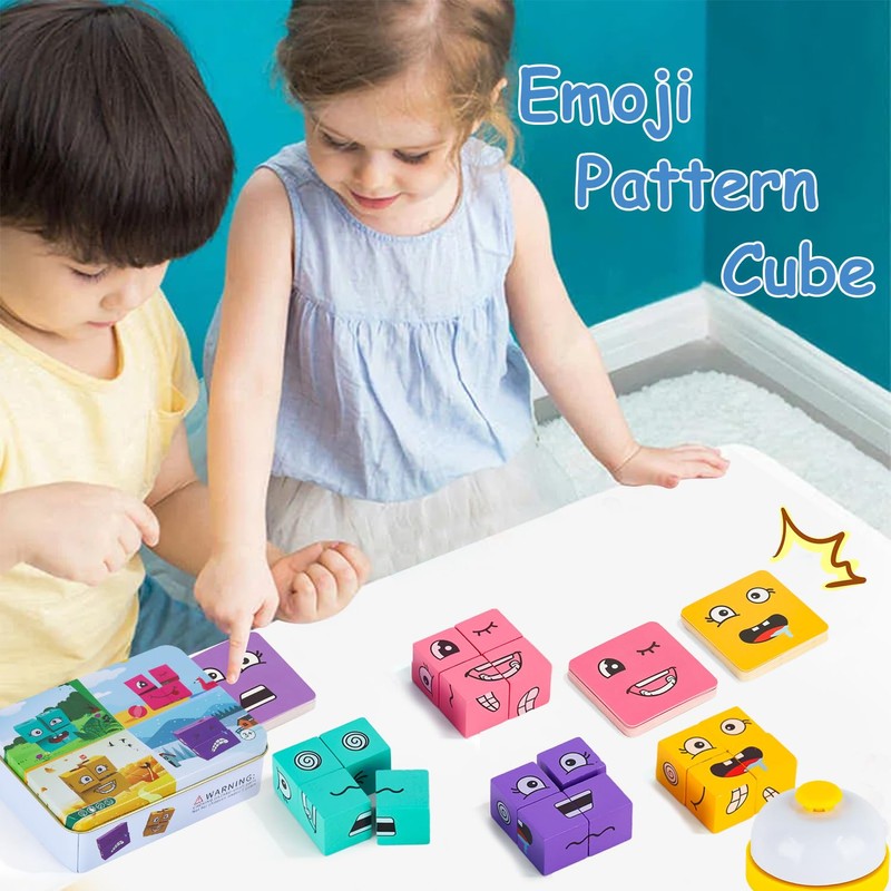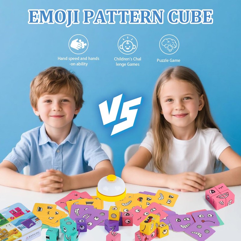 • Wooden cube emoji puzzle: a total of 16 blocks, 4 sets of emoji, 1 table bell, 72 pattern cards. The puzzle building cube is suitable for 1-4 people to play at the same time and is a fun and challenging educational toy.