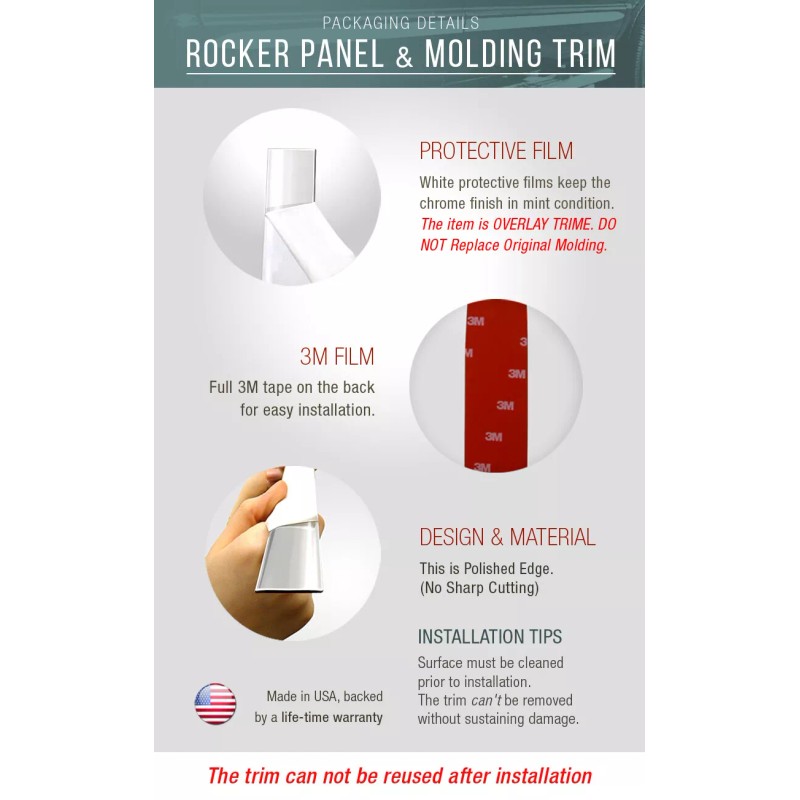- The Trim Can't Be Re-applied Afer Your Initial Installation. Please Test Fitting Before Peel Off The Tape.