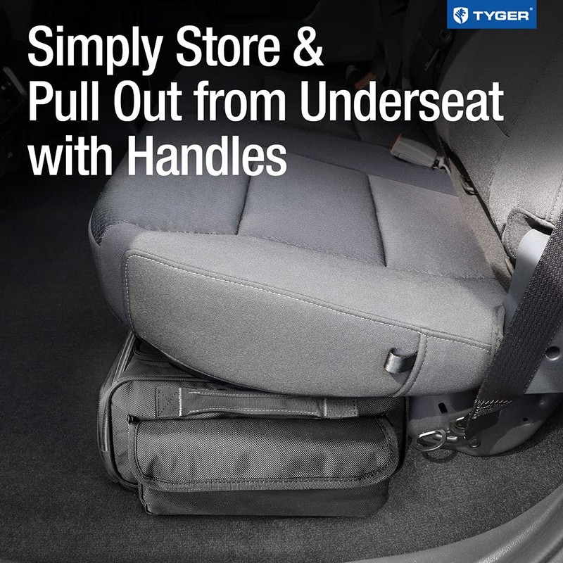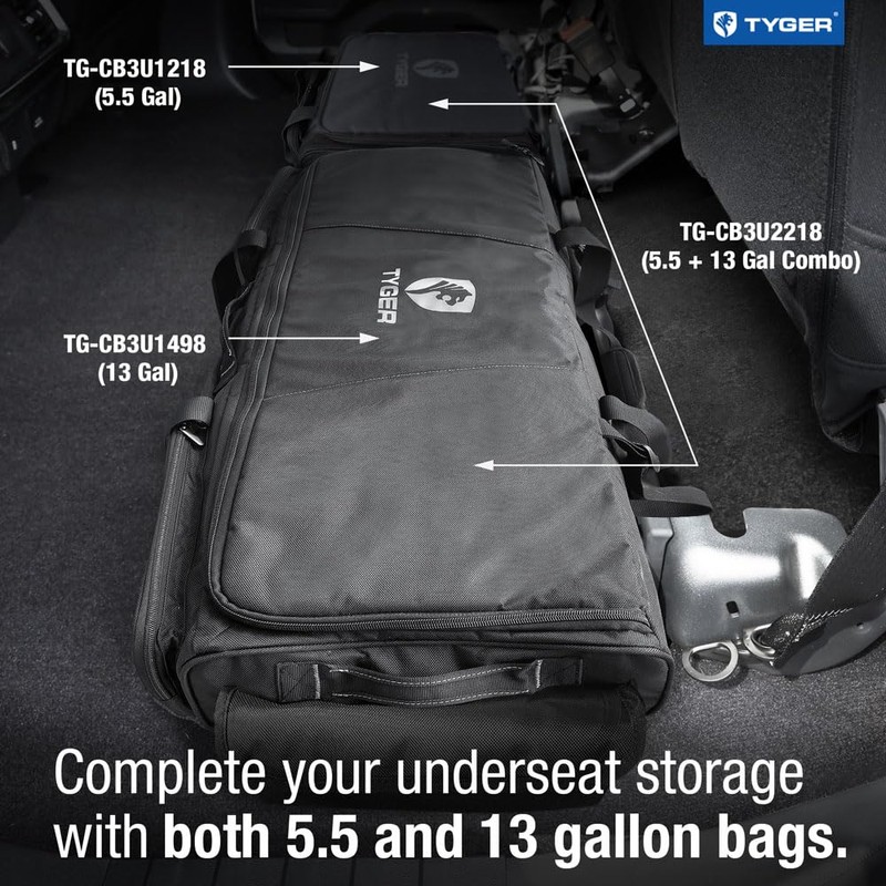 In need of a carry on storage solution for your full size pickup truck? Tyger's Underseat Cargo Bag combines the benefits of an underseat storage box and the convenience of a carry on luggage in one package. This bag is made with premium polyester and silky smooth zippers which provides water resistance and allows for easy cleaning. While tucked neatly underneath the rear seat of your full sized pick up, the cargo bag enables you to organize your belonging with the included dividers and pockets. Combine this 5.5 gallon model with and the larger 13 gallon model to cover the entire underseat space. Tyger Auto focus on developing premium aftermarket auto parts that meet or exceed OE quality standards.