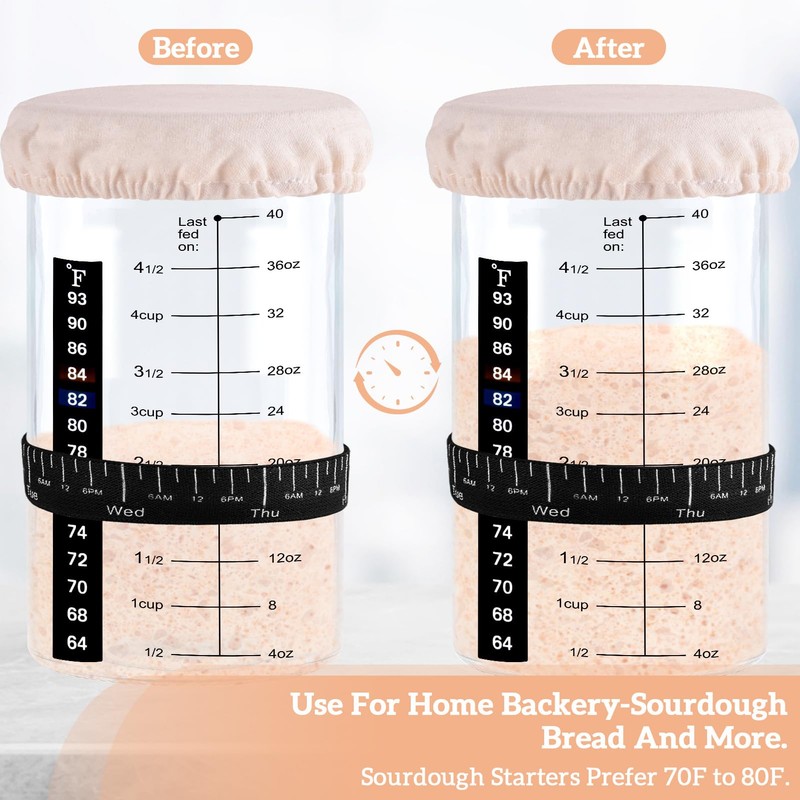 • Monitor Temperature and Feeding: The kit comes with an instant-read thermometer that allows you to monitor the temperature of your starter and ensure that it's in the optimal range for fermentation activity. The feeding day tracker band helps gauge starter rise in the jar, making it easier for you to keep track of your sourdough starter's progress.