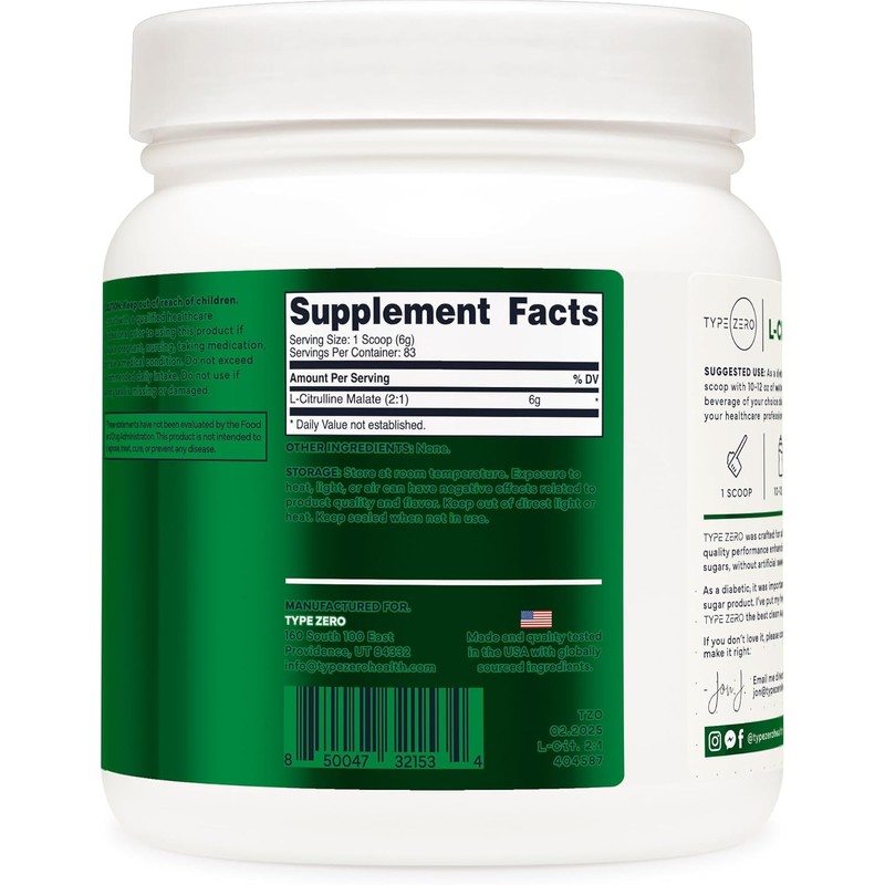 Type Zero- Clean LCitrulline Malate 2:1 Mezcla para Bebida en Polvo (500g, Sin Sabor) (83 Porciones) Keto Friendly, Glu