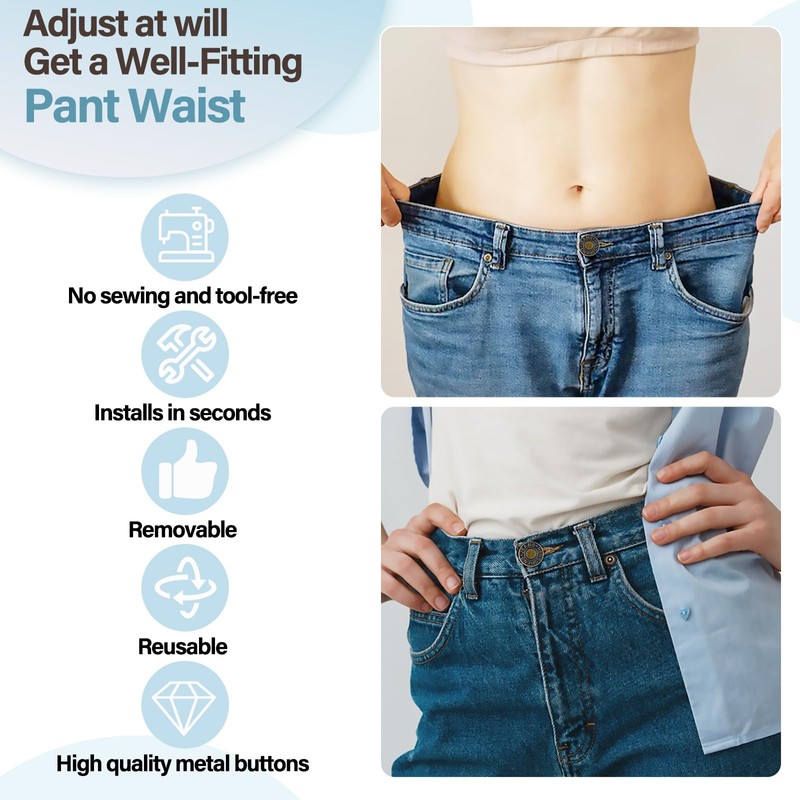 - No Sew: Button pins for jeans can instantly adjust the size when the waist of the pants is too loose, allowing you to say goodbye to belts and stay comfortable all day long