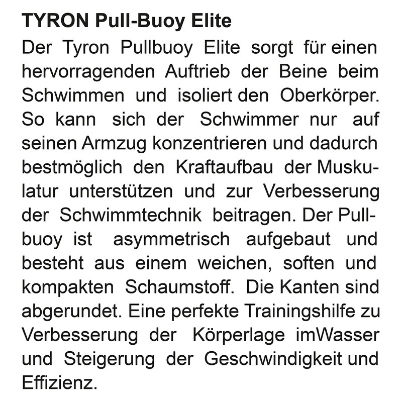 - Excellent leg buoyancy: The Tyron Pullbuoy Elite provides optimal buoyancy of the legs when swimming, which gives the swimmer a better water position and can concentrate fully on his arm pull.