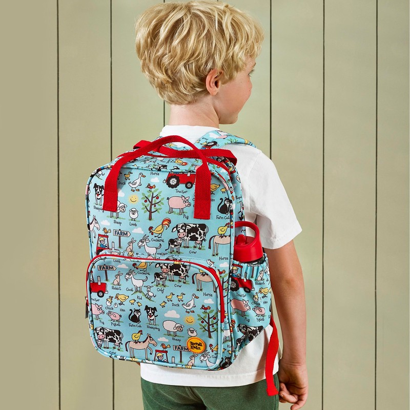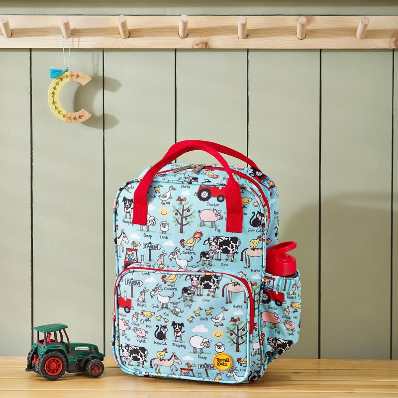 Tyrrell Katz Farm Printed Backpack in Blue - Double Zip Kids School Rucksack with Bottle Pocket, Twin Handles & Adjustable Straps · Fits A4 Books · Made from Recycled Polyester