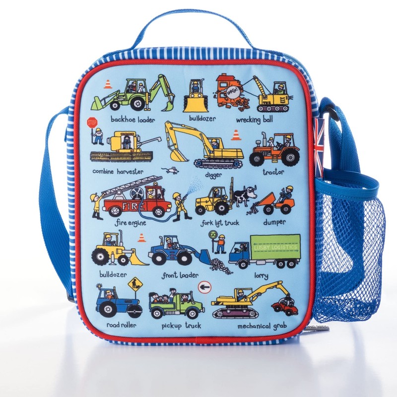 Tyrrell Katz Kids Insulated Trucks Printed Lunch Bag in Blue - Children's Zip Meal Tote with Adjustable Strap and Bottle Holder - 21.5 x 24.5 x 6 cm