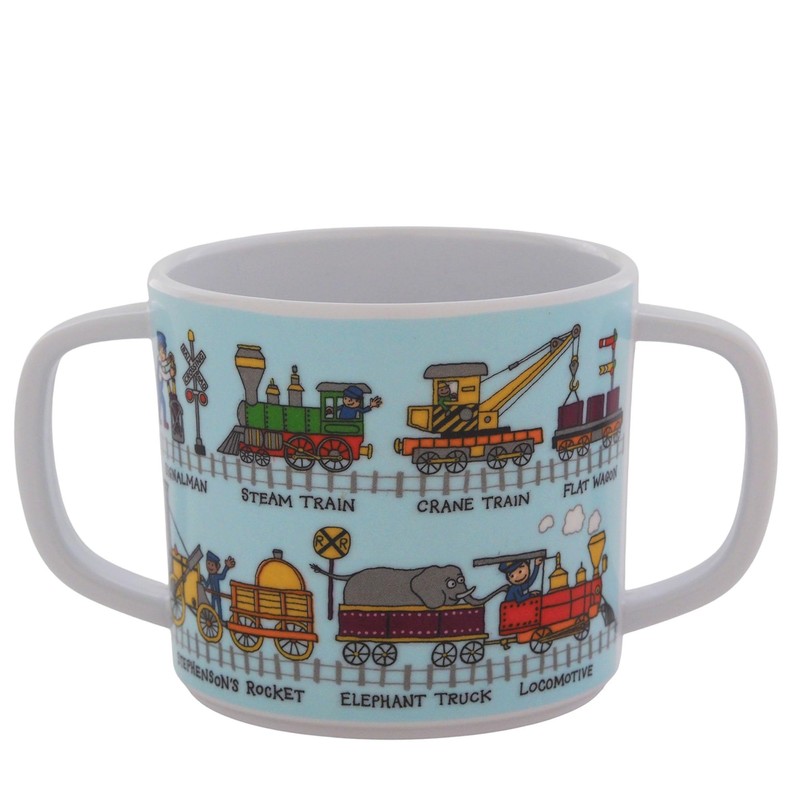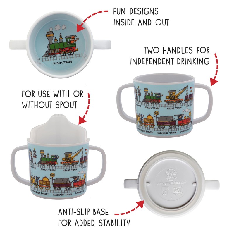 Two-handled toddler sippy cup in Trains print. The cup has a lid with a small spout to make it easy for little ones to drink from. The lid can then be removed when they are ready to transition to an open cup. The two handles make it easier for toddlers to hold and encourage independent drinking. The anti-slip base helps to prevent accidental spillages on smooth surfaces such as high-chair trays. Features a colourful character on the interior base.