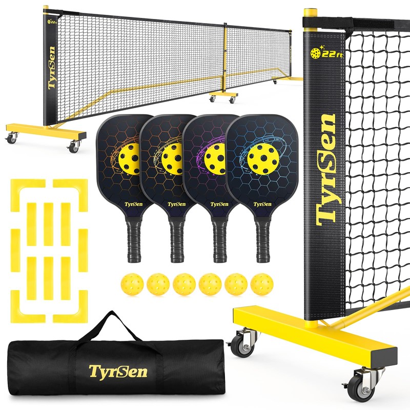 TYRSEN Pickleball Net Set - Pickleball Net on Wheels for Driveway Backyard, 22FT Regular Size, 4 Fiberglass Paddles & 6 Balls, 12 Court Markers, Portable Pickle Ball System with Carry Bag