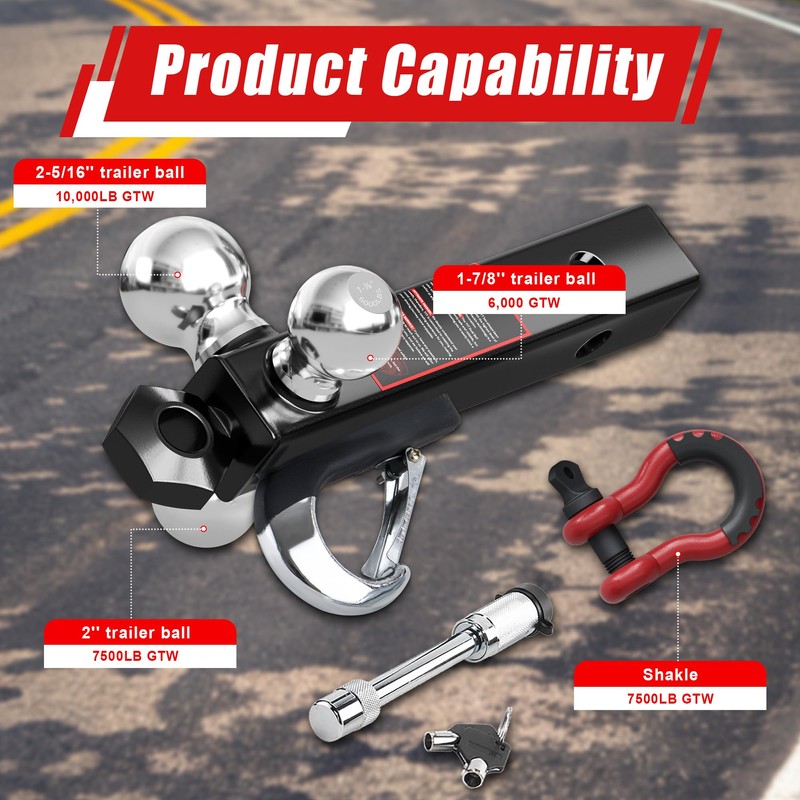 TYT Tri Ball Hitch Trailer Mount with Locks, Tow Hook & Clevis Shackle, Fits 2 Inch Receiver with 2-5/16", 2", 1-7/8" Ball, Black