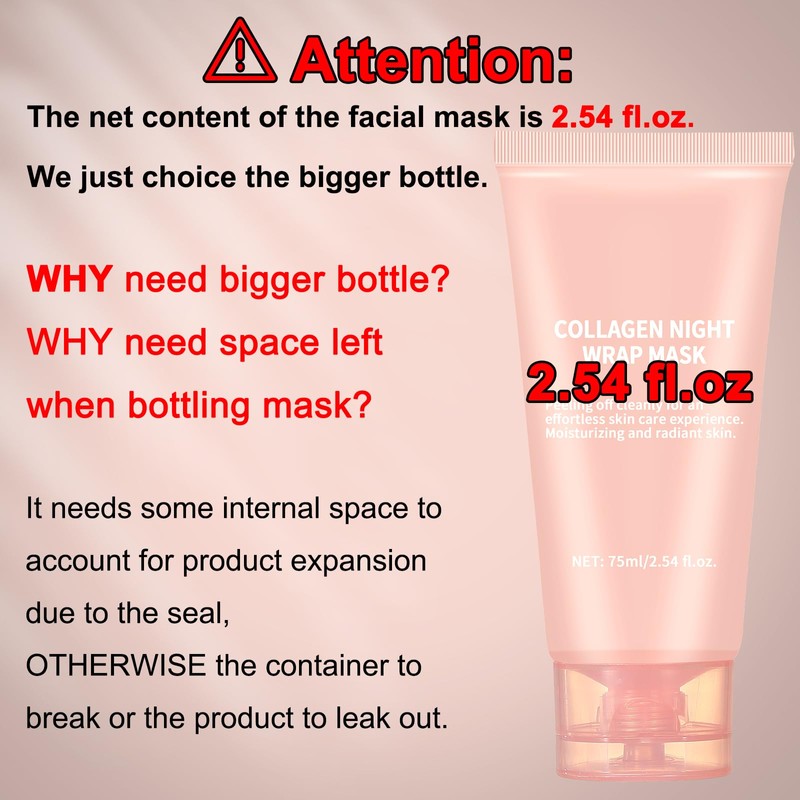 - ?Don't worry, Net content is 2.54 fl.oz?Our item requires some internal space to account for product expansion from increased temperature, otherwise the container to break or the product to leak out. So we chose a bigger bottle. But the net content of the mask is 2.54 fl.oz.