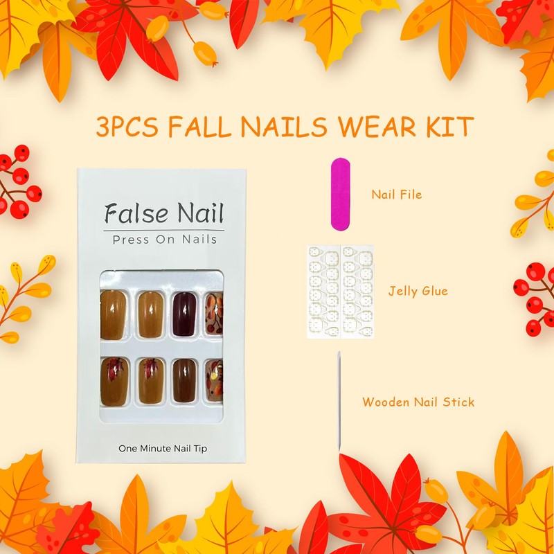 • Fall Glue on Nails Kit: There are 24pcs of short square artificial finger nails 12different sizes, 1 mini nail file, 1 small wooden stick, 1 nail sticker in the package.(Jelly glue doesn't last as long as liquid glue, but it can make fake nails reusable. Please use suitable glue according to different occasions)