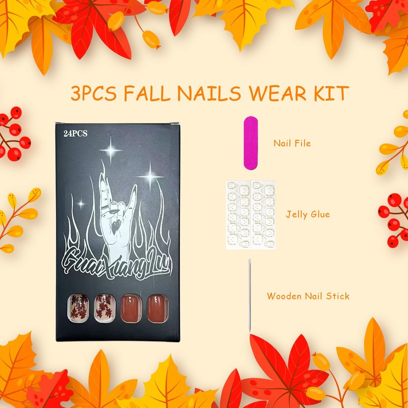 - Fall Glue on Nails Kit: There are 24pcs of short square artificial finger nails 12different sizes, 1 mini nail file, 1 small wooden stick, 1 nail sticker in the package.(Jelly glue doesn't last as long as liquid glue, but it can make fake nails reusable. Please use suitable glue according to different occasions)