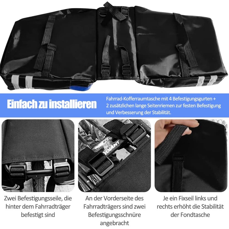 - Easy to install and reflective: bicycle boot bag with 4 attachment straps + 2 additional long side straps for firm attachment and improve stability. The lanyard strap can be attached to the pannier rack to avoid rubbing the tyres. There are reflective strips on both sides so you are safe when cycling at night.